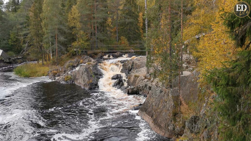 Вид с экотропы на знаменитые Рускеальские водопады на реке Тохмайоки с водой цвета «Кока-колы» или заваренного чая