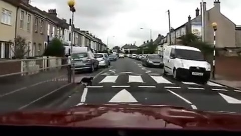 Кошка переходит дорогу по зебре.