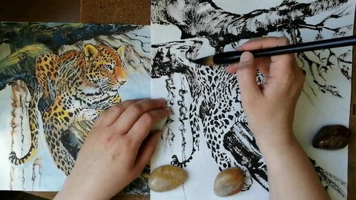 Тушь, минеральные краски и китайская кисть: Леопард))) Бумага пейзажная для китайской живописи. Свободный стиль.
