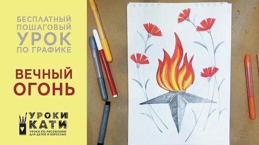 Как нарисовать вечный огонь фломастерами, открытка на 23 февраля пошаговый урок для детей от 6 лет