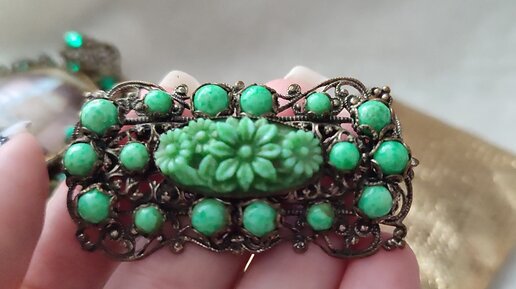 Шикарная винтажная брошь с зеленым пекинским стеклом
