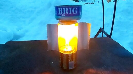 Как же я раньше это не смастерил. Теперь мне светло и еда согрета. Сделал из банок светильник.