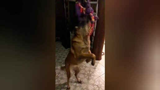 Забавная овчарка висящая на верёвке