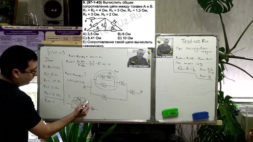 Вычислить общее сопротивление цепи между токами А и В. R1 = R2 = 4 Ом, R3 = 5 Ом, R4 = 1,5 Ом, R5 = 3 Ом, R6 = 2 Ом.