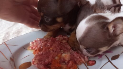 Такие маленькие, а уже хищники ! Завтрак щенят чихуахуа.