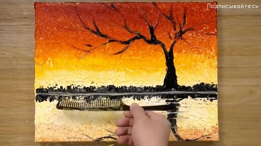 Живопись акрилом🎨 Рисуем пейзаж с помощью расчёски🖌️ Техника для начинающих