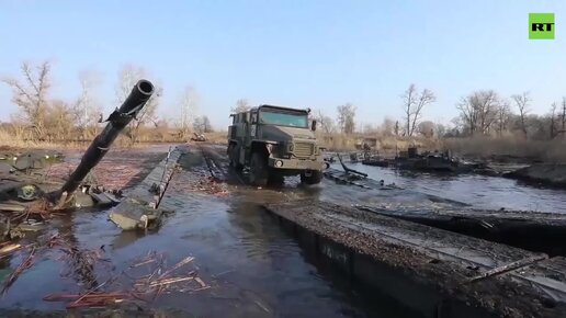 Минобороны России опубликовало кадры движения боевой техники по понтонной переправе через реку Северский Донец.