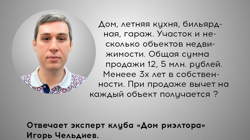 Участок и несколько объектов недвижимости. Сумма продажи 12, 5 млн. рублей. Менее 3х лет в собственности. Налоги?