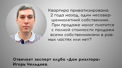 При продаже налог платится с полной стоимости продажи всеми собственниками (1 несовершеннолетний) в равных частях или нет?