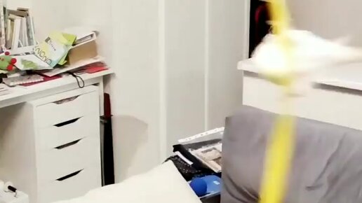 Прицепился к ленточке и крутится.