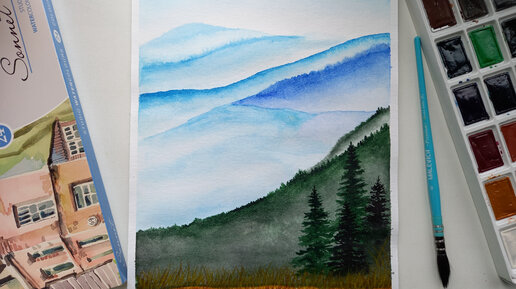 Простой пейзаж с елями на фоне гор. Акварель.