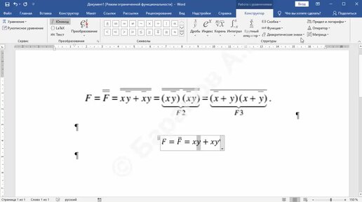 Пример ввода логического выражения со знаками инверсии с помощью встроенного редактора формул Word 2019
