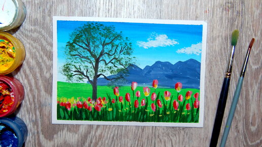 Как нарисовать весенний пейзаж с тюльпанами гуашью