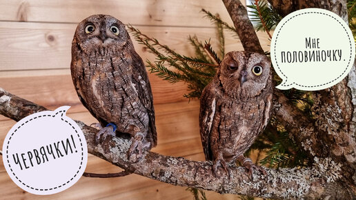 Совы дружат за червячков. Веточки тоже надо подкармливать вкусняшками