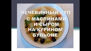 Чечевичный суп с маслинами и сыром на курином бульоне