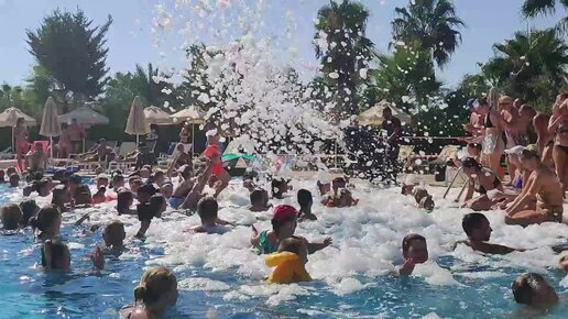 Обзор пенной дискотеки в турецком отеле у бассейна под музыку. Показываю как она проходит и сколько народу собирается
