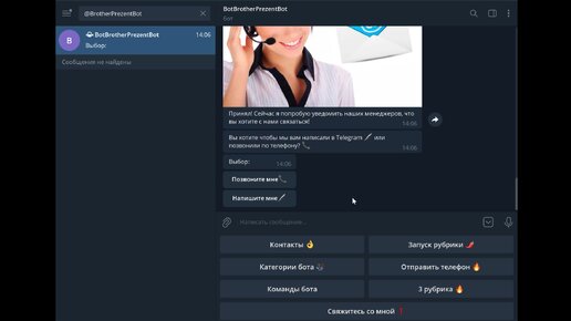 Демонстрация работы кнопки "Свяжитесь со мной" в боте Telegram