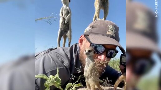 Сурикаты облюбовали фотографа и использовали его как смотровую площадку