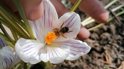 Первая пчела на крокусе. Наш садик на даче в Подмосковье апреле 2022