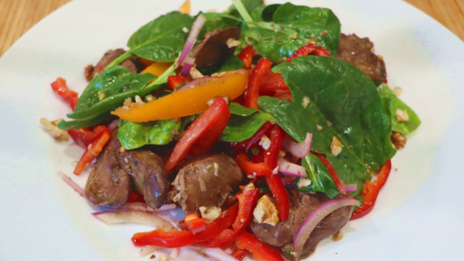 Салат с куриной печенью, томатами, перцем и грецким орехом