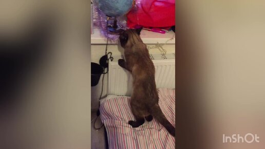 Упрямый котик лижет новогоднюю мишуру и не хочет уходить.