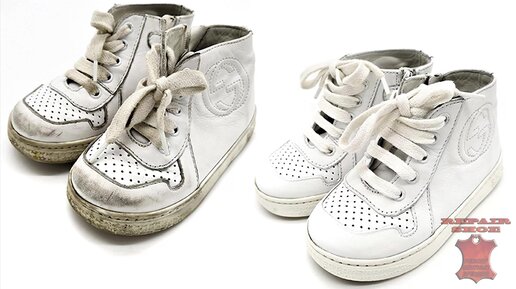 Реставрация кожи детских кроссовок Gucci химчистка и отбеливание подошвы