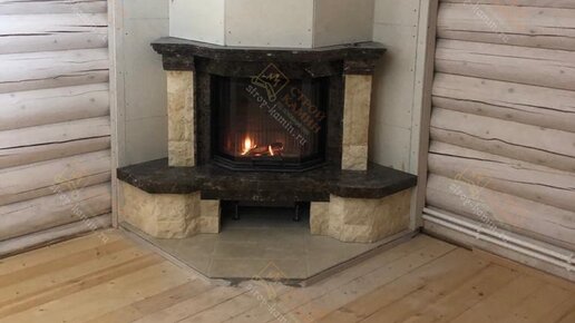 Дом из бревна с угловым дровяным камином Кантри- топка АСТОВ ПП 6957 в облицовке из мрамора под ключ, от мастеров Стройкамин