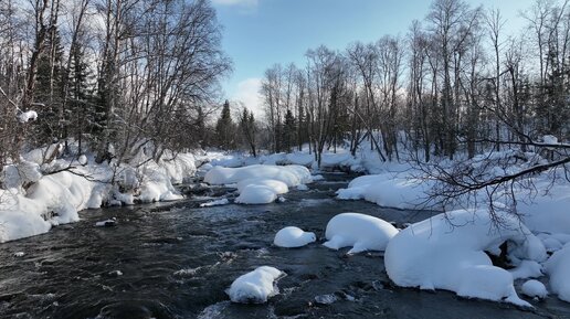 Полет на коптере над зимней рекой