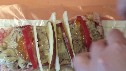 Утиная грудка, запеченная с сыром, яблоками и помидорами.