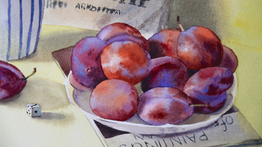 Спидпейнтинг процесса написания натюрморта с сливами в акварельной технике.