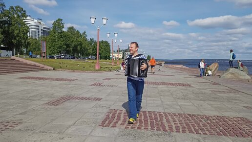 Гуляй, Петрозаводск 2021. Баянист Павел Сивков прогуливается с баяном по набережной города ветреным днём. Звуки баяна, переборы