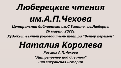 Люберецкие чтения, 26 марта 2022 г., Наталия Королева, рассказ А.Чехова "Закулисная история"