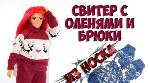 Свитер с оленями из носка для куклы Барби / Как сшить свитер из носков