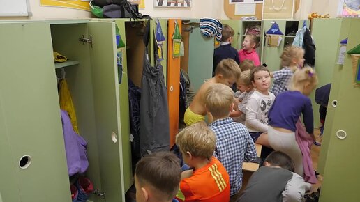 Дети гуляют на площадке в детском садике. Подготовка детей к обеду.