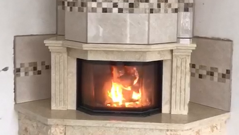 Дровяная эркерная топка АСТОВ ПП 8857 в угловом мраморном камине от Стройкамин - изготовление и монтаж под ключ в коттедже