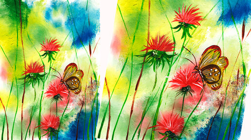 Как нарисовать полевые цветы. Рисуем бабочку. Летний пейзаж гуашью.