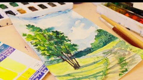 Рисую летний пейзаж акварелью. Дорога уходящая в даль.