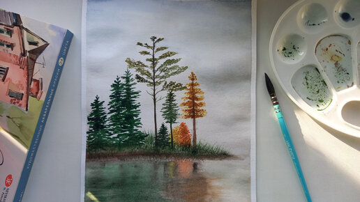 Простой пейзаж. Как нарисовать лес на берегу реки. Акварель.