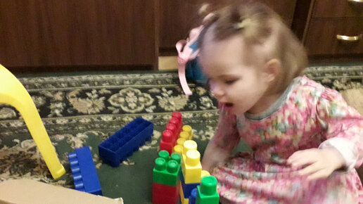 Как весело играть в Лего. Ксюшка - хохотушка 2 х лет с удовольствием как строит, так и ломает гараж.