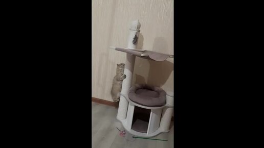 Кошечка Гепардик ползет по когтеточке.