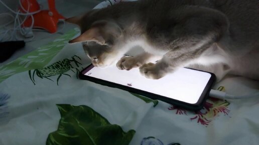 Сингапурская кошка Луна увлечённо играет в телефон.