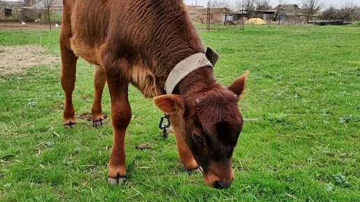 Телочка посется на лугу, привязана цепями! Сельская жизнь, будни КРСкота!