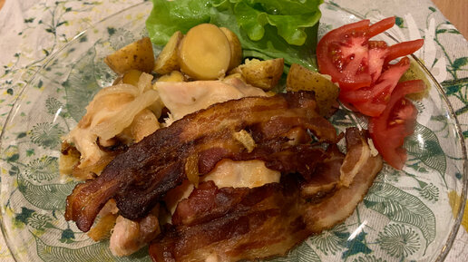 Запечённая курица, с беконом и картошкой . Просто и очень вкусно.