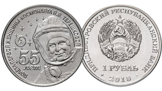 1 рубль ПМР 55 лет полета первой женщины космонавта В.В. Терешковой.