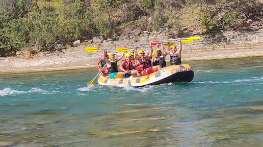 Экскурсия рафтинг в Турции. Туристы сплавляются на лодках по горной реке. Приветствие их с берега