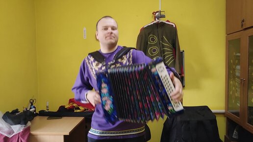 Павел Сивков разыгрывается на гармони перед выступлением на фестивале "Народная музыка - наши традиции" 16.04.2022