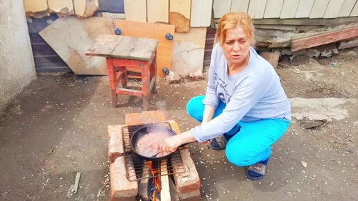 Жена готовит обед на костре . Из глубинки деревни .