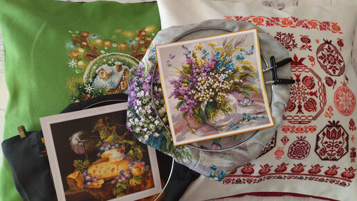 Вышиваю ЧУДЕСНУЮ ИГЛУ и РИОЛИС/ Подушки готовы/ Как я делаю французские узелки/ Вышивка крестом /