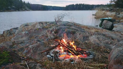 Костер у озера, потрескивающие дрова, расслабляющие звуки костра