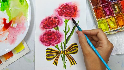 Рисунок на 9 мая. Как нарисовать гвоздику и георгиевскую ленту акварелью поэтапно. Акварель для начинающих